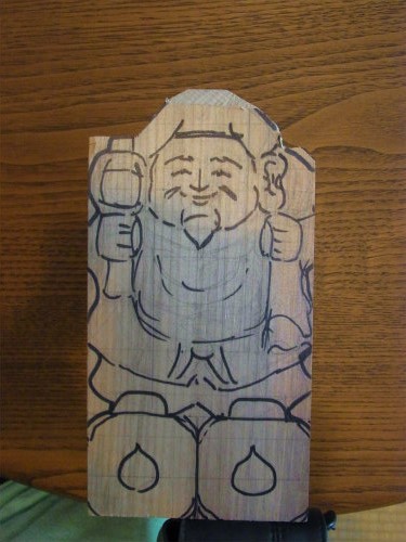 今度の大黒様はカツラの木で彫るよ。倍の大きさしています。